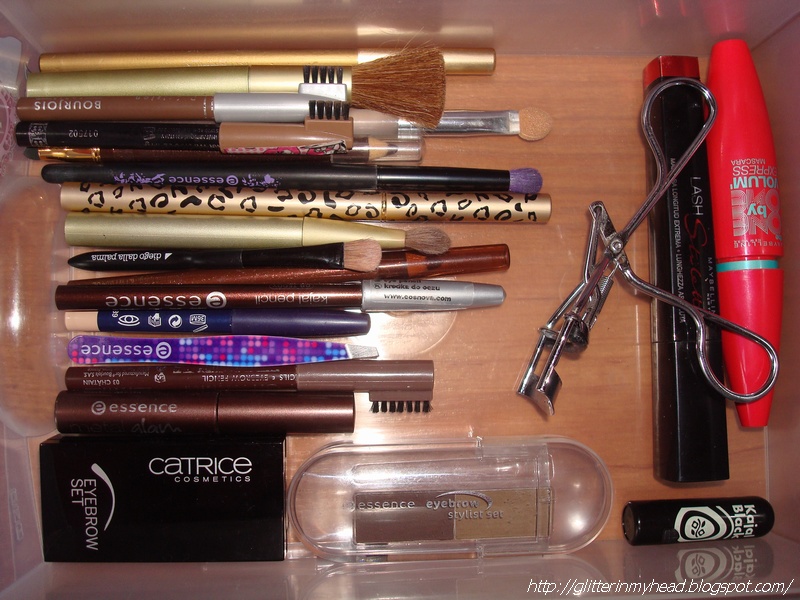 - tusze, zalotka, kredki do oczu i brwi, cienie do brwi, pęseta, liner, pędzle i aplikatory.